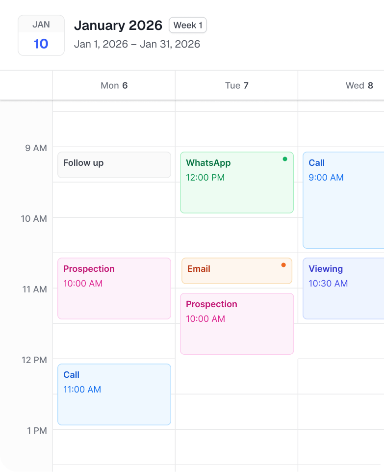 Manage property visits, meetings, and calls in one shared calendar. Keep agents aligned and schedules clear, so everything runs on time.