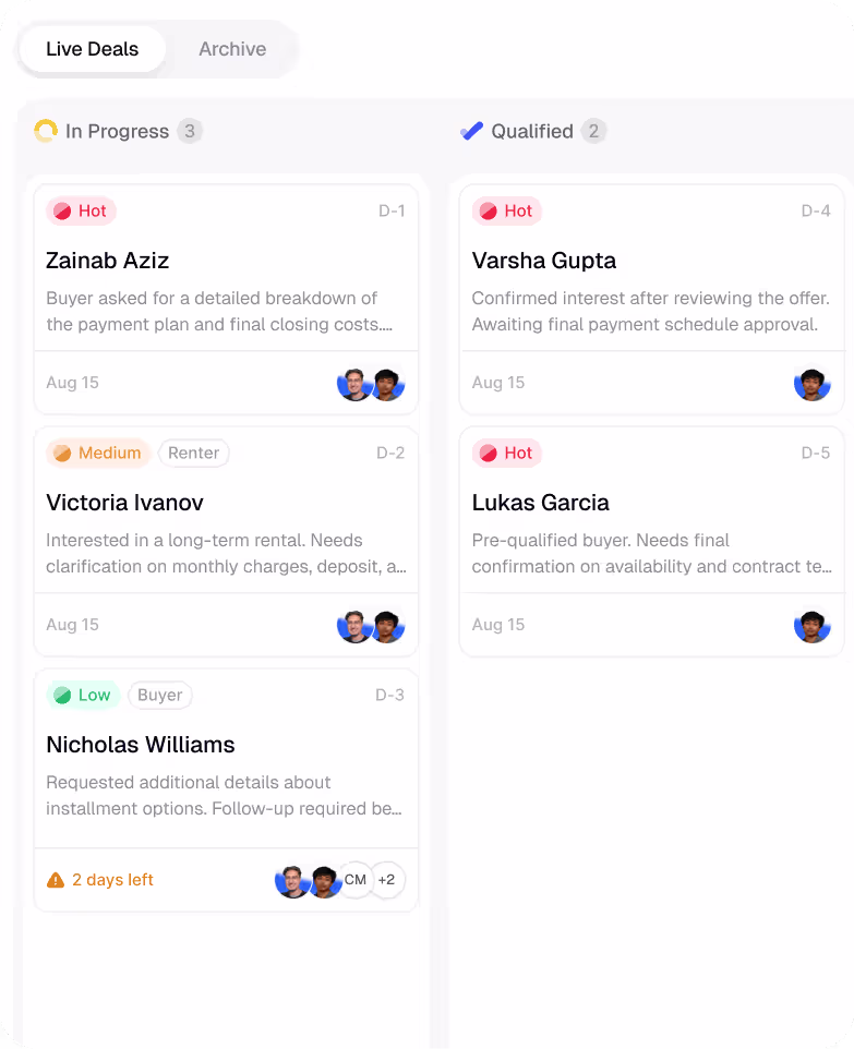Track performance across properties, leads, and deals in real time. Clear insights help your team spot what works, fix what doesn’t, and make smarter decisions faster.